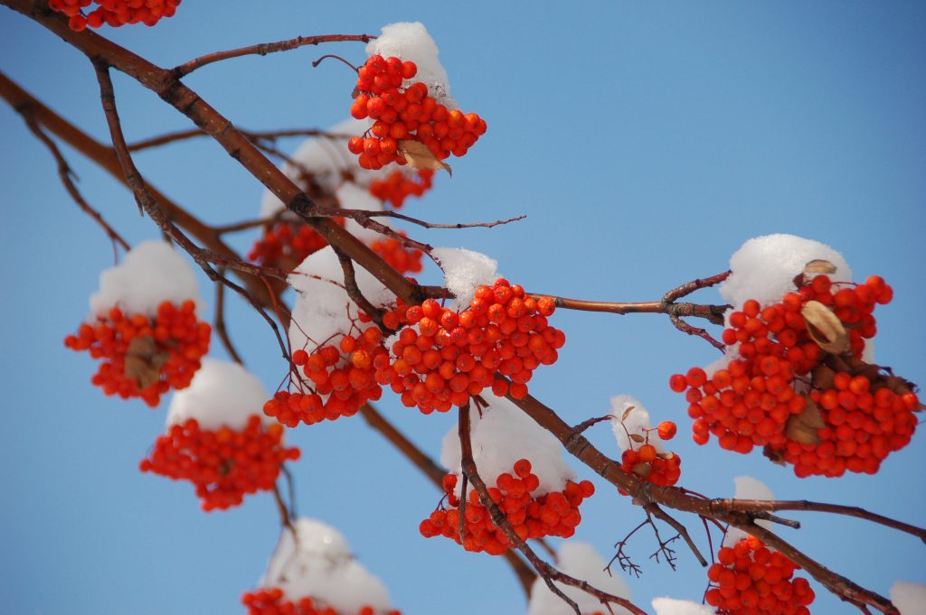 医院近隣の歩道に植えてあります街路樹には葉は落としましたがナナカマドの実はまだ残っており、実に雪を付けた情景が気になりましたので一枚撮ってみました。(一月一日撮影)